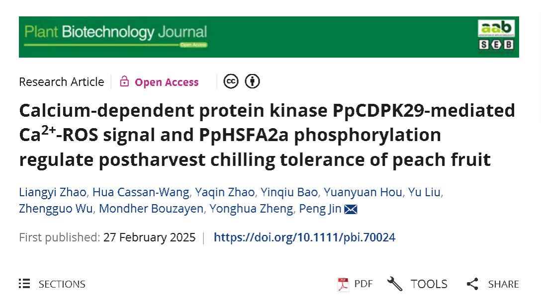 近日,Plant Biotechnology Journal在线发表了南京农业大学郑永华教授和金鹏教授课题组题为“Calcium-dependent protein kinase PpCDPK29-mediated Ca2+-ROS signal and PpHSFA2a phosphorylation regulate postharvest chilling tolerance of peach fruit”的研究论文,该研究揭示了钙依赖蛋白激酶PpCDPK29通过Ca2+-ROS信号通路以及对PpHSFA2a磷酸化作用调控桃果实采后冷害的分子机制。