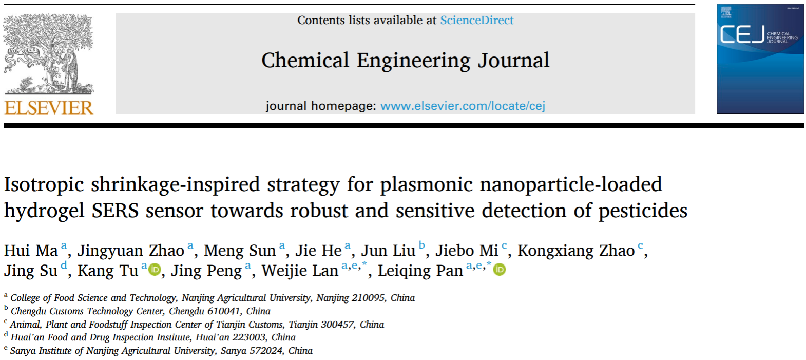 近日,我校bat365正版唯一官网屠康教授和潘磊庆教授团队,利用水凝胶体系中“乙醇-水”快速置换促使柔性表面增强拉曼光谱(SERS)基底“热点”致密化,实现了快速、灵敏、多场景的农药残留分析。相关研究成果以“Isotropic shrinkage-inspired strategy for plasmonic nanoparticle-loaded hydrogel SERS sensor towards robust and sensitive detection of pesticides”为题,在国际著名期刊Chemical Engineering Journal在线发表。