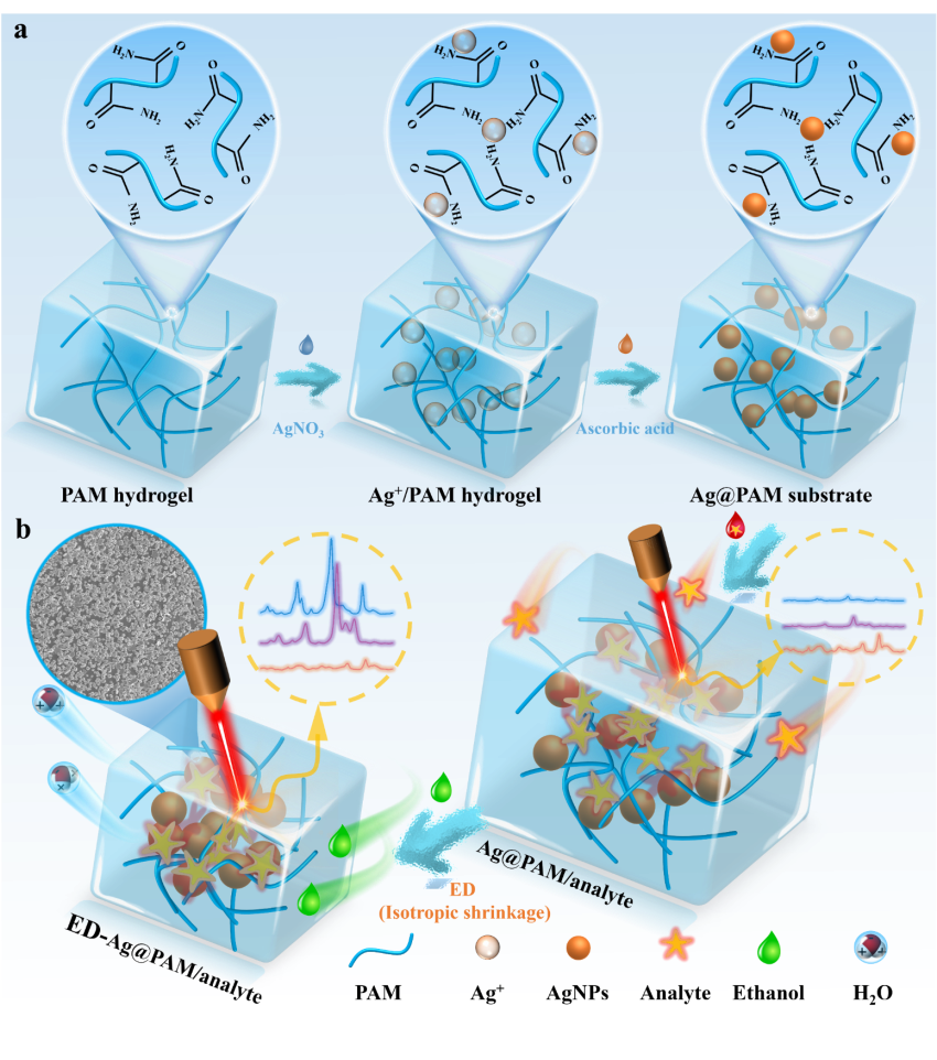 潘磊庆教授团队创新性地利用聚丙烯酰胺(PAM)水凝胶作为SERS基底框架,通过“乙醇-水”快速置换方法,实现了水凝胶的“各向同性”收缩。这种收缩方式使得水凝胶中的银纳米粒子(AgNPs)紧密聚集,形成了均匀且密集的“热点”分布,显著增强了拉曼信号的强度和稳定性。实验表明,与传统风干(AD)方法相比,乙醇脱水(ED)处理的Ag@PAM水凝胶在12分钟内即可实现快速SERS增强,且信号均匀性显著提高(RSD < 10%),对4-硝基苯硫醇(4-NBT)的检测信号提升了17倍,检出限(LOD)低至2.21×1012 M (~3.43 × 10–13 gmL−1)