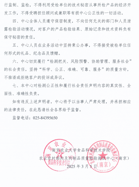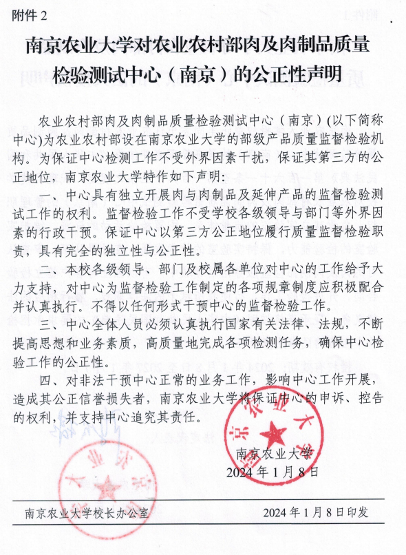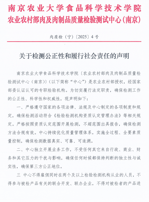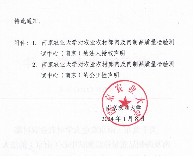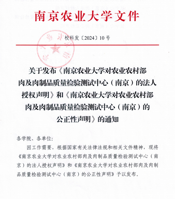 农业农村部肉及肉制品质量检验测试中心(南京)(以下简称“中心”)是农业农村部部级产品质量检验测试中心,中心根据农业农村部(农质发〔2013〕1号)文组建。中心于2015年3月通过国家认监委农业组的国家计量认证、食品检验机构和农业部检验机构考核、审查认可的首次评审,获得资质认定计量认证证书、食品检验机构资质认定证书、农产品质量安全检测机构考核合格证书、农业农村部审查认可证书。中心主管部门是南京农业大学,由南京农业大学法人授权独立对外开展检验业务,中心有相对独立账目,独立核算,为具有第三方公正性的肉及肉制品质量检验机构,是社会公益性技术服务事业单位。